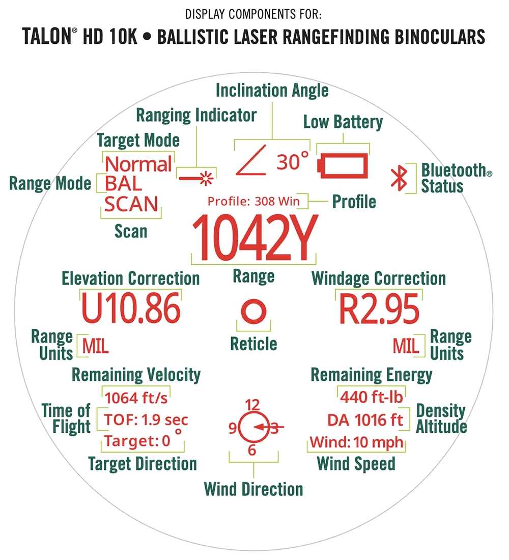 –              Ballistics (BAL) Displays the actual line of sight range and wind/drop solution.