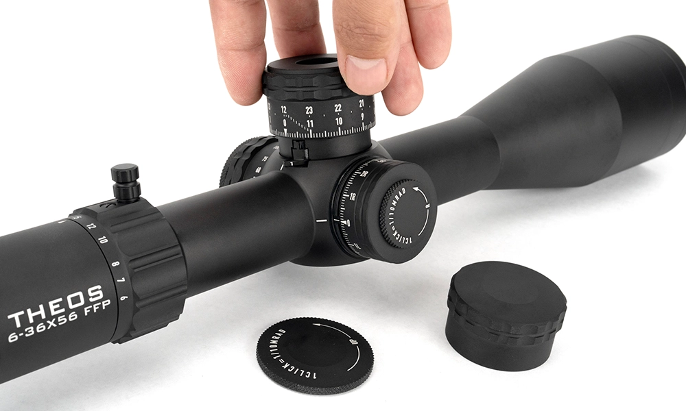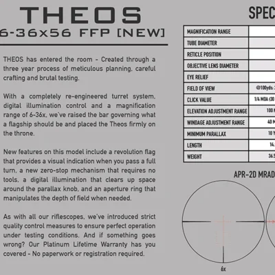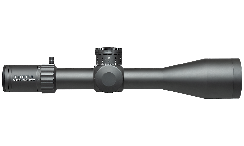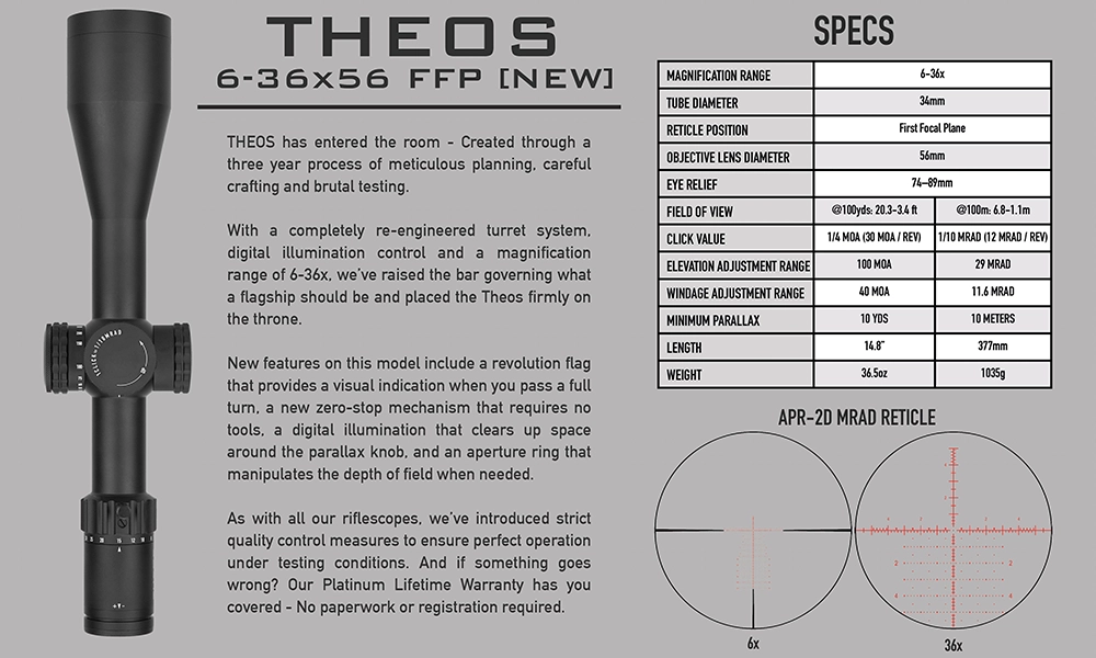 THEOS has entered the room – Created through a three year process of meticulous planning, careful crafting and brutal testing. With a completely re-engineered turret system, digital illumination control and a magnification range of 6-36x, we’ve raised the bar governing what a flagship should be and placed the Theos firmly on the throne. New features on this model include a revolution flag that provides a visual indication when you pass a full turn, a new zero-stop mechanism that requires no tools, a digital illumination that clears up space around the parallax knob, and an aperture ring that manipulates the depth of field when needed.