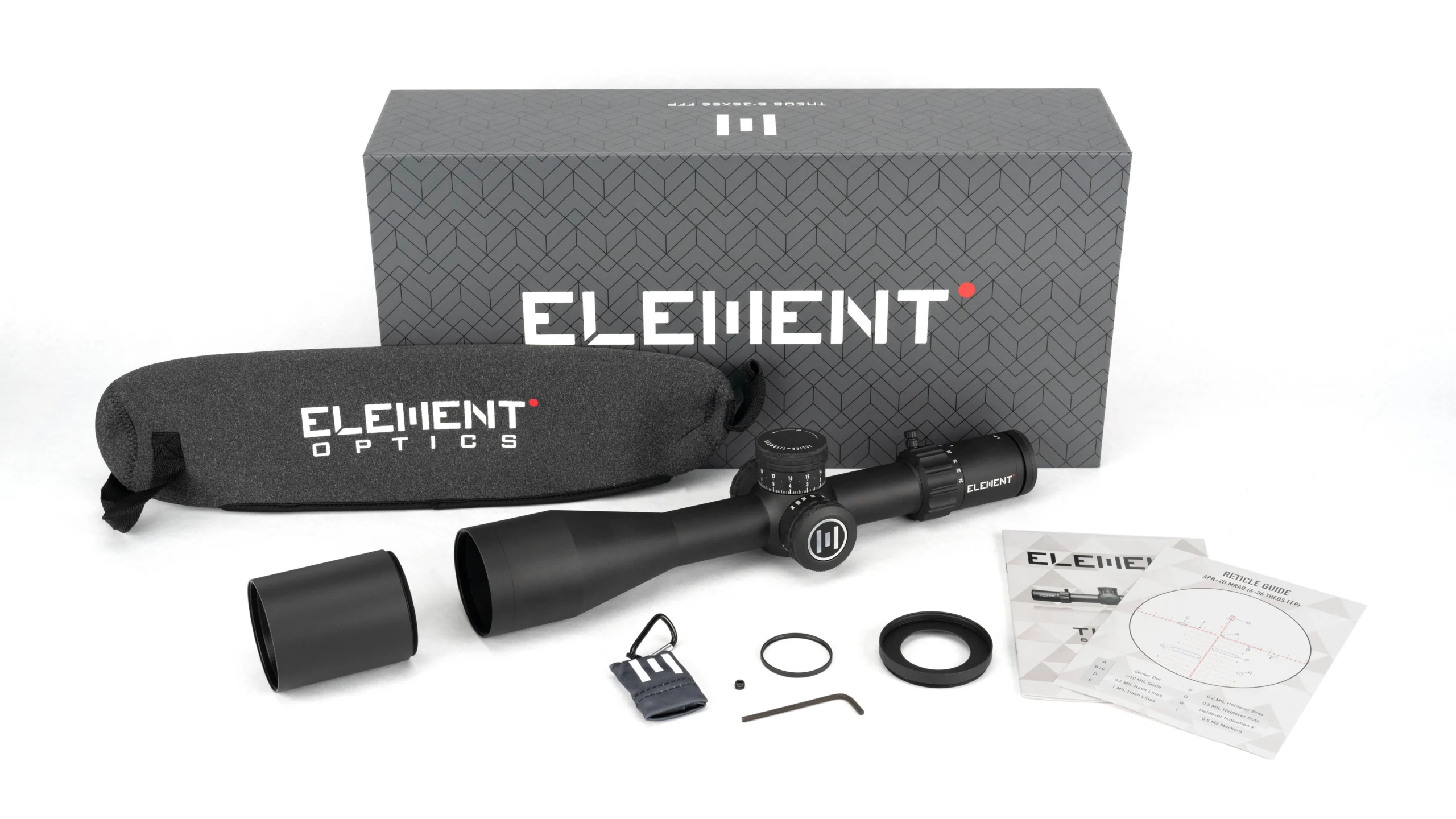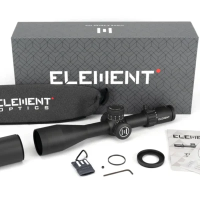 The Element Optics Theos 6-36×56 is a high-end, first focal plane (FFP) riflescope built for long-range precision, featuring a versatile 6-36x magnification, durable 34mm tube, advanced re-engineered turrets with tool-free zero-stop and revolution indicator, and digital illumination control for its APR-2D reticle, making it ideal for competitive and extreme-distance shooting with exceptional clarity and repeatable adjustments.