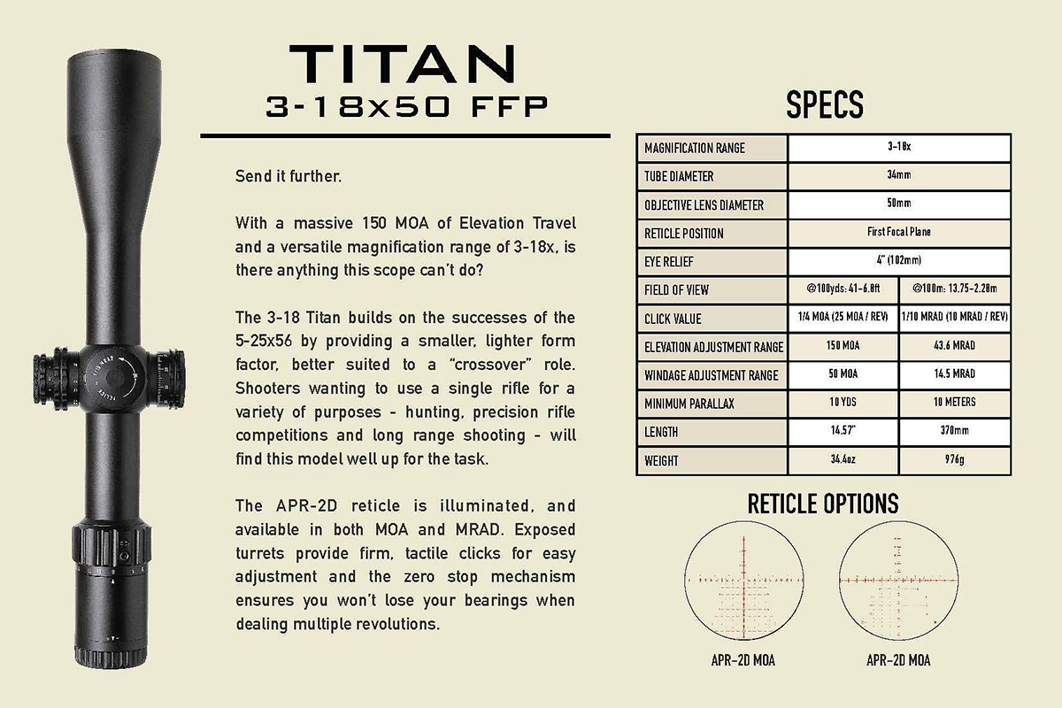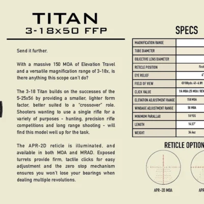 Element Titan riflescopes are high-value, first focal plane (FFP) optics featuring a robust 34mm tube, ED glass for clarity, and precision stainless steel turrets with tool-free resets and a hard zero-stop, making them versatile for both hunting and precision shooting, backed by a Platinum Lifetime Warranty.