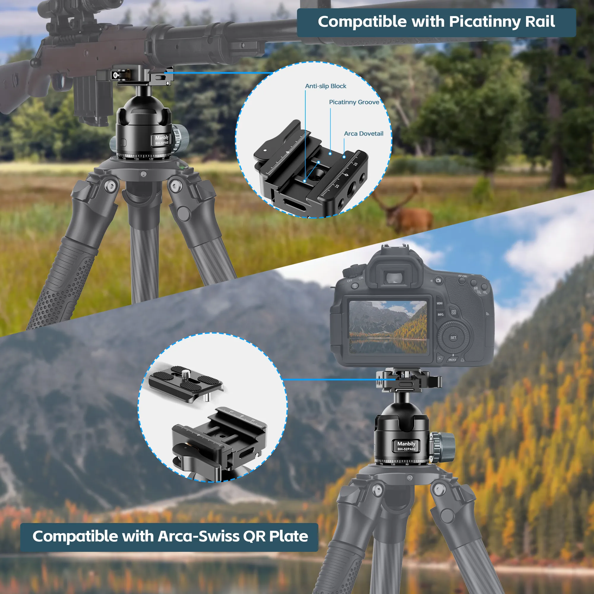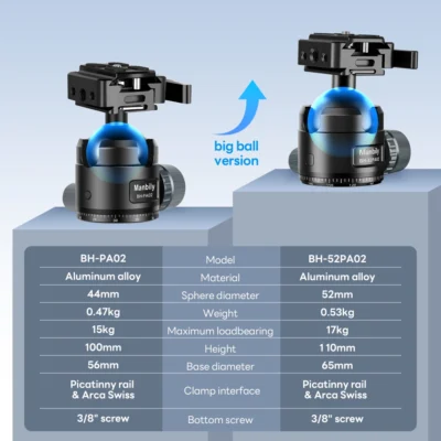 The Manbily BH-52PA02 is a heavy-duty, low-profile ball head designed specifically for hunting and precision shooting, featuring a dual-mounting system that supports both Arca-Swiss plates and Picatinny rails. It is characterized by its large 52mm ball, high load capacity, and robust construction, suitable for mounting rifles, spotting scopes, and cameras.