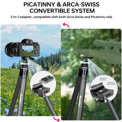 • Picatinny Arca-Swiss Adapters: 2-in-1 Picatinny to Arca-Swiss adapter with a 1/4 inch quick-release plate(60mm × 38mm ). Remove the QR plate to convert the adapter into a Picatinny clamp, compatible with most Picatinny-equipped gear. It provides photographers and hunters with unmatched flexibility and convenience