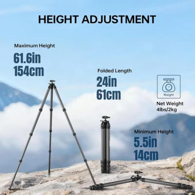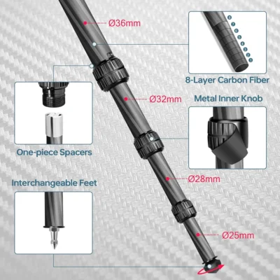 • Heavy Duty, 4-Section Carbon Fiber Tripod, made of 8-layer carbon fiber, making it strong and stable. With a maximum leg diameter of 36 mm, it offers unparalleled stability and can withstand challenging environments