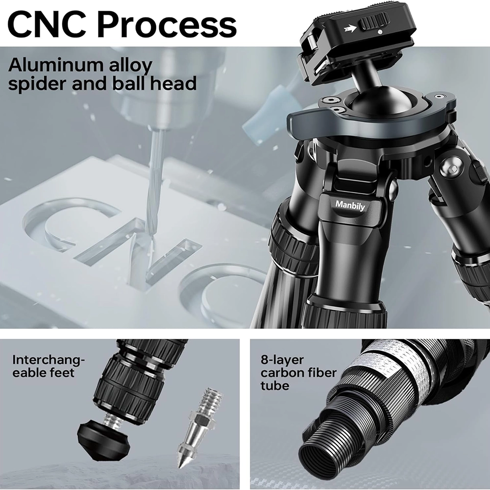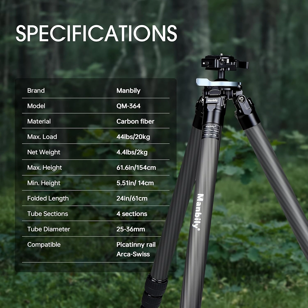 The Manbily tactical-grade carbon fiber tripod features a large 36mm top leg section diameter, resulting in a lightweight but very stable and robust design with 40% increased torque resistance.